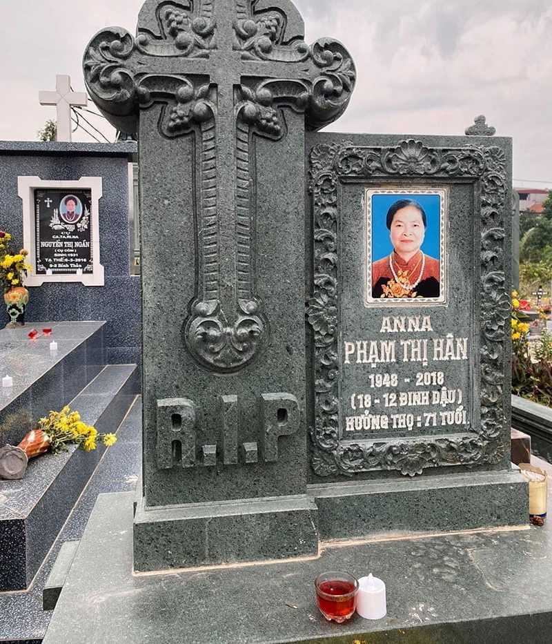 Trên bia mộ, ngoài các thông tin cơ bản như họ và tên người mất, ngày tháng năm sinh, năm mất, hưởng dương thì phía trên họ và tên còn được khắc tên các vị thánh trong Công Giáo như: Pedro (phê-rô), Anton (An-tôn), Anna (An-na), Giuse, Mát-ta, Maria, Anre (An-rê), Daminh (Đa Minh), Paulo (Phaolo)